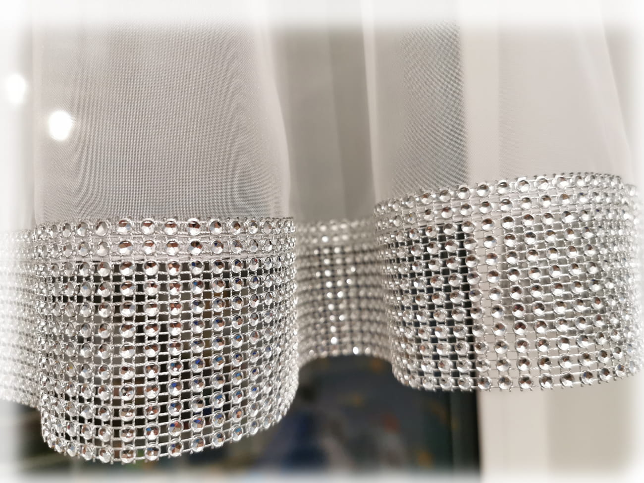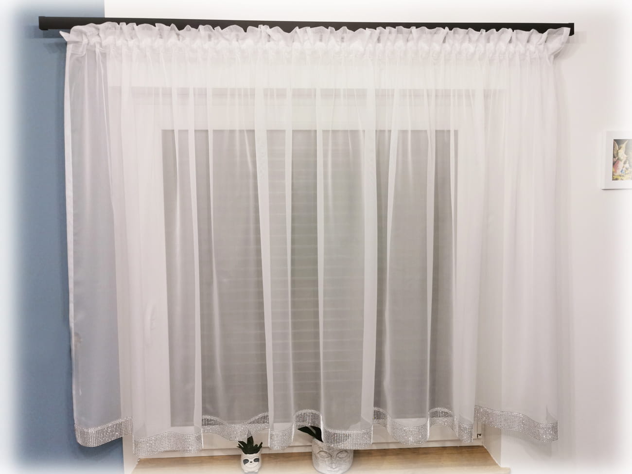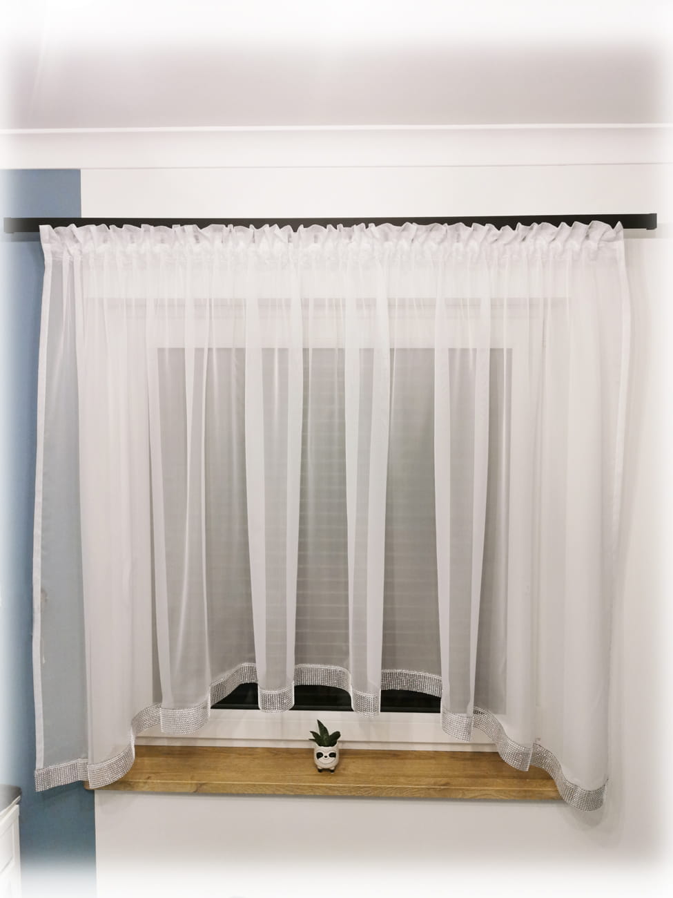 firanka wykonana z woalu obszyta taśmą z cyrkoniami o szerokości 6 cm, na taśmie marszczącej smok 1:2 o szer 5 cm .