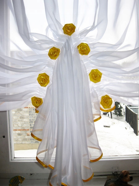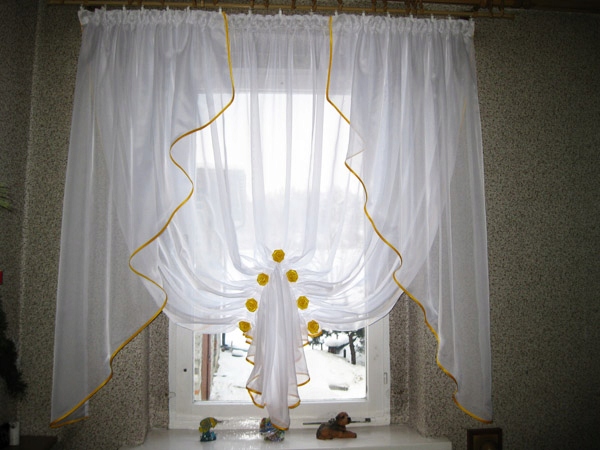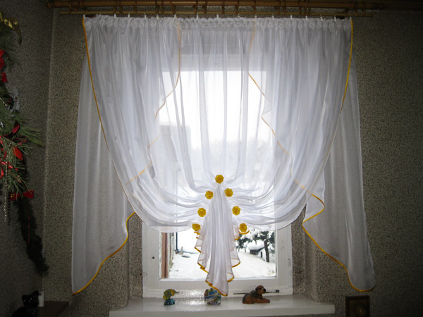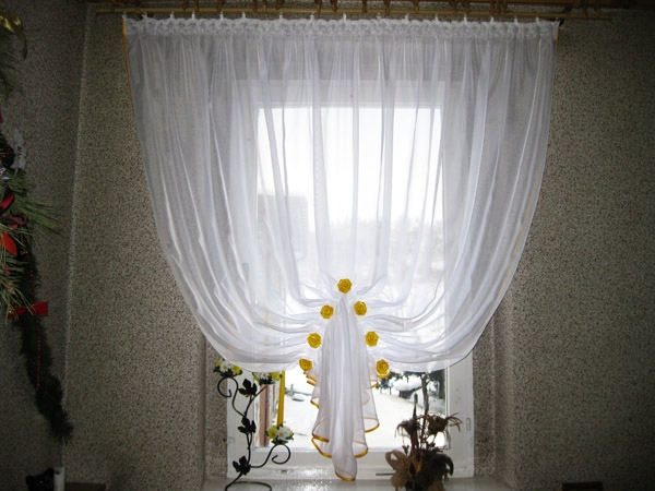 Doskonale pasuje na karnisz o długości od 130cm do 180cm. Główną ozdobą firanki są różyczki lub kokardki doszyte z dwóch stron firanki.