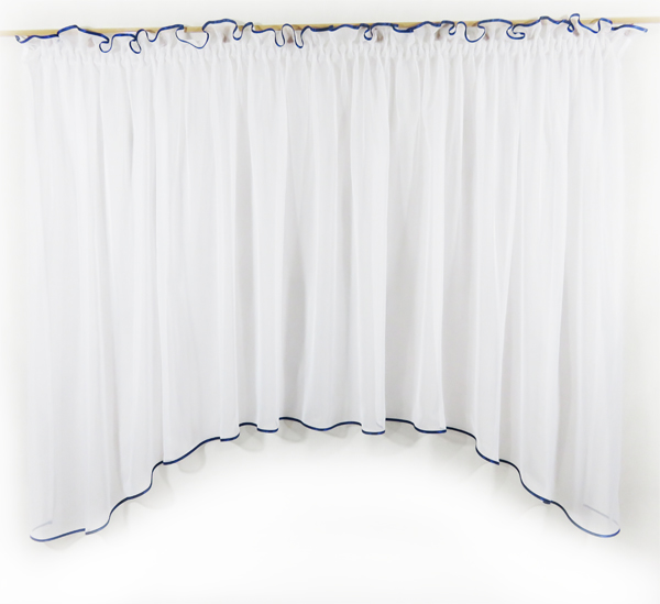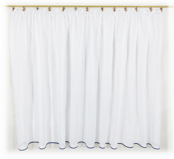 Firanka wykonana z woalu obszyta atłasową lamówką, na taśmie smok 1:2 o szerokości 5 cm.