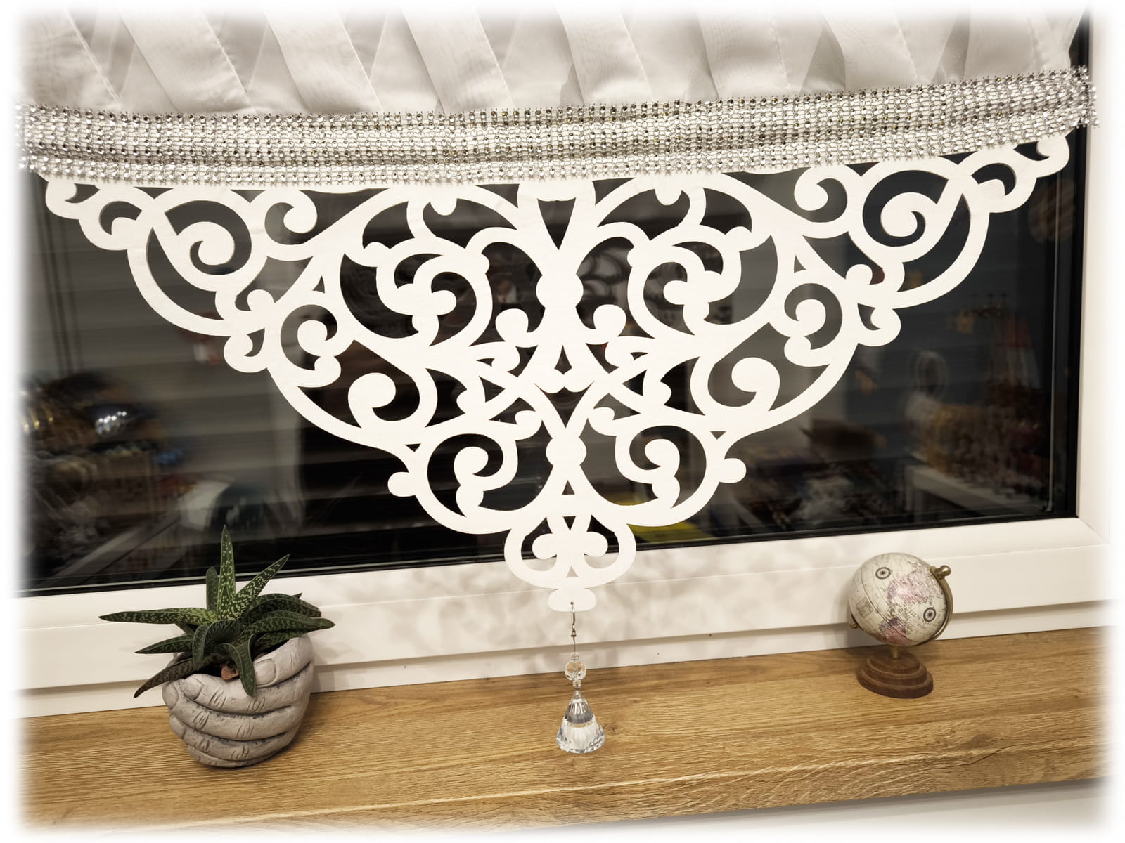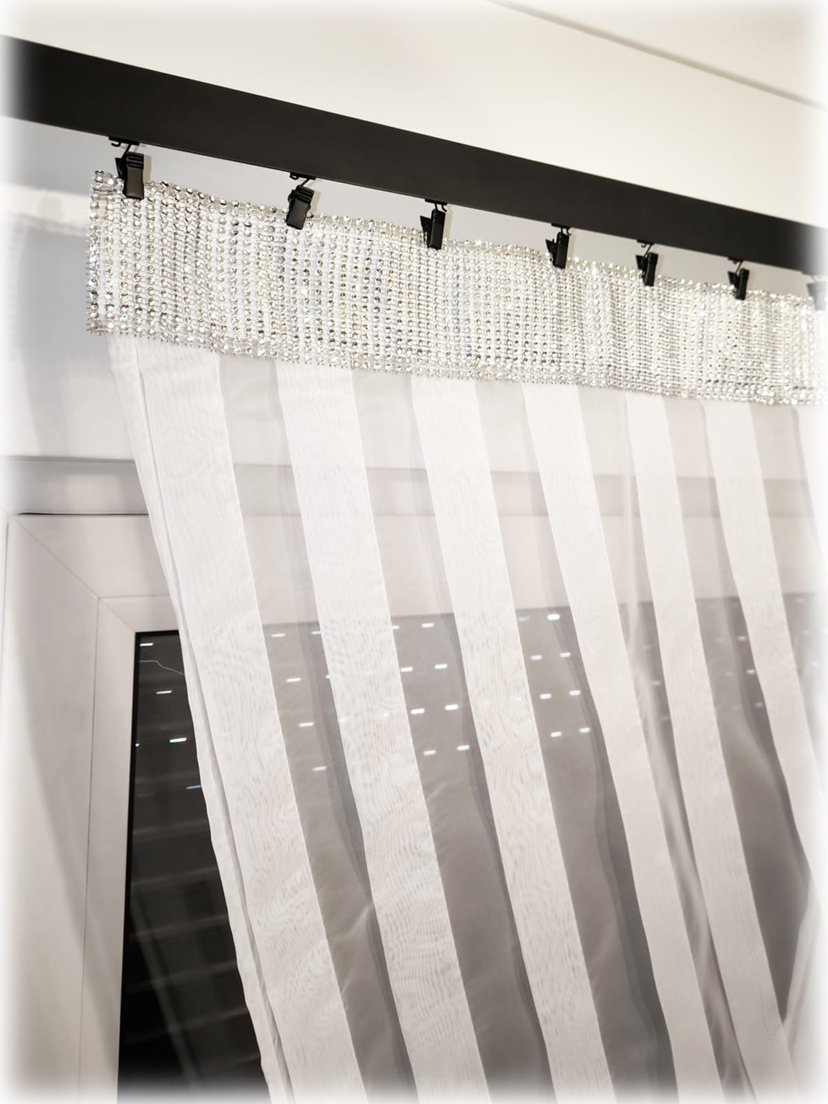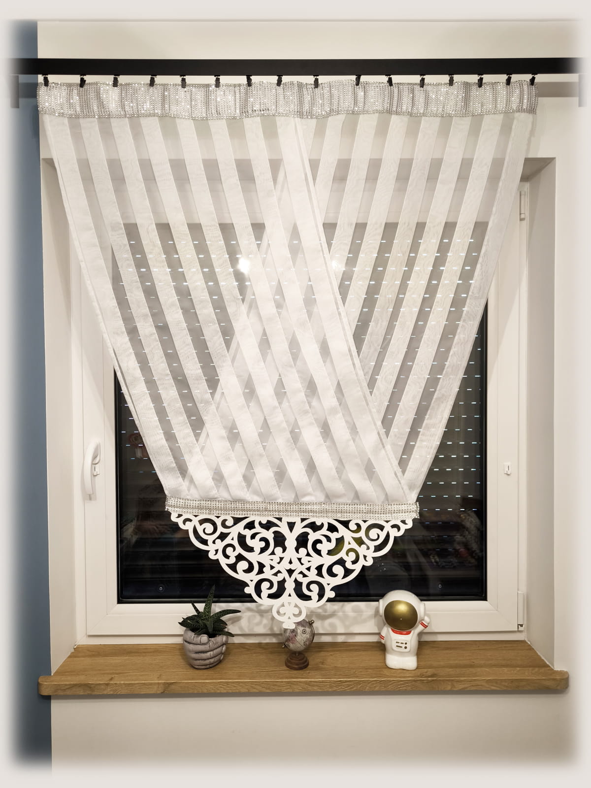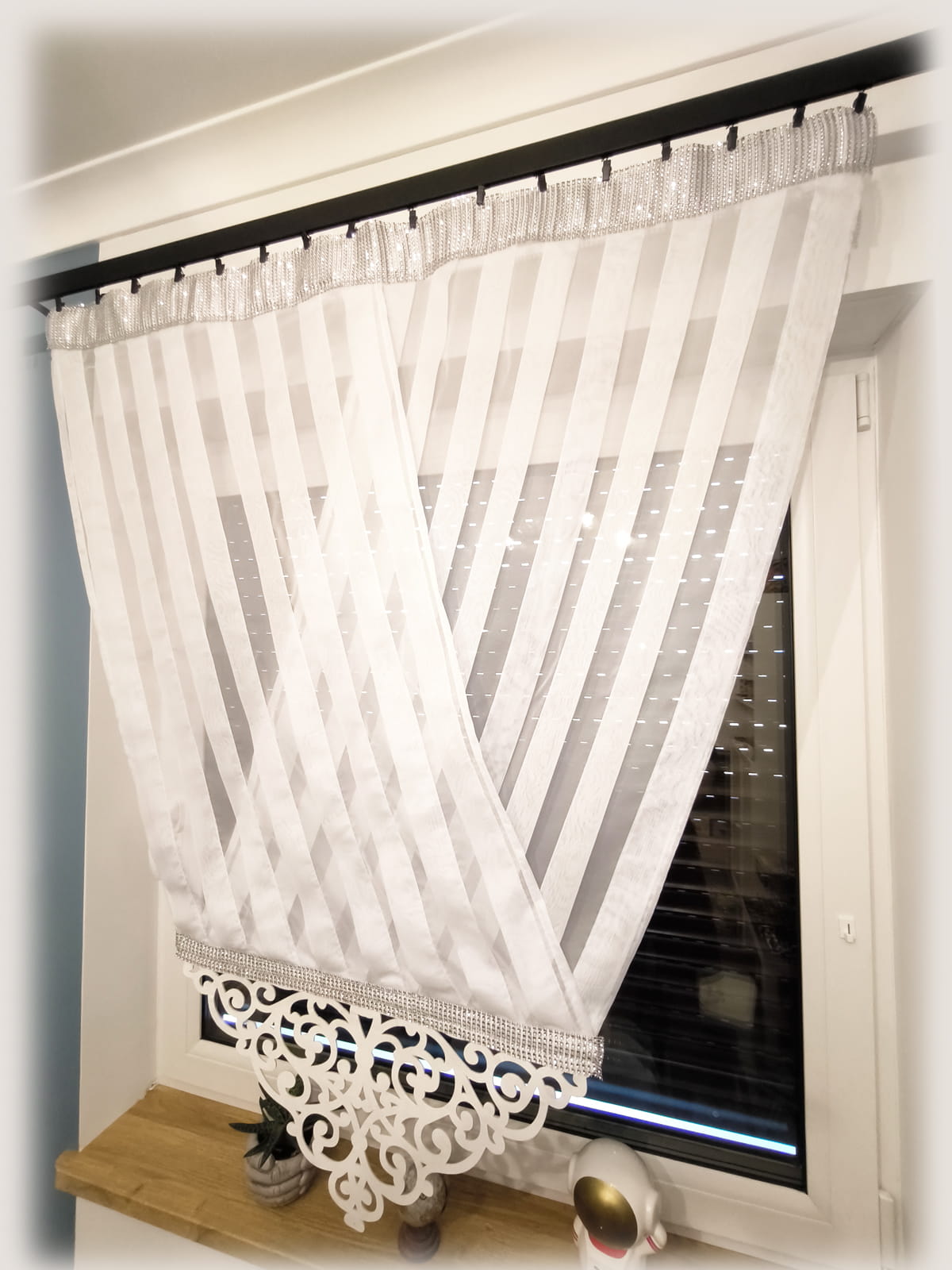 Panel okienny uszyty z gładkiego woalu szyty na zakładki. U góry wszyty tunel na karnisz rurkowy wykończony pasem z cyrkonii. Dół wykończony ażurem z grubego filcu również obszyty cyrkoniami.
