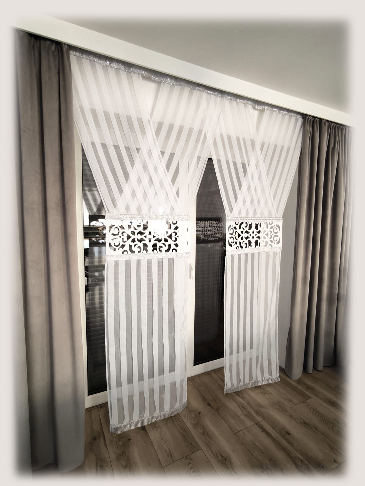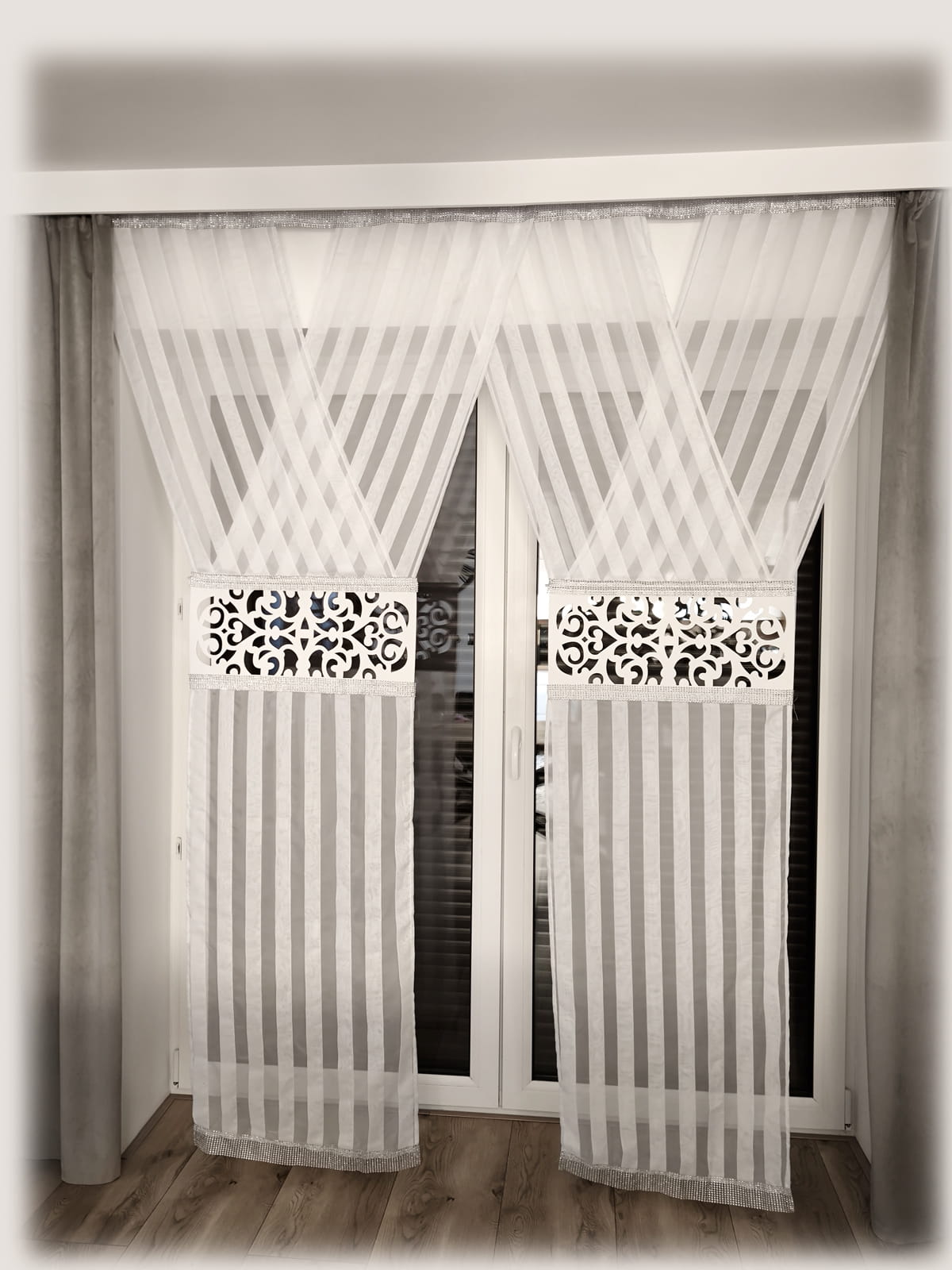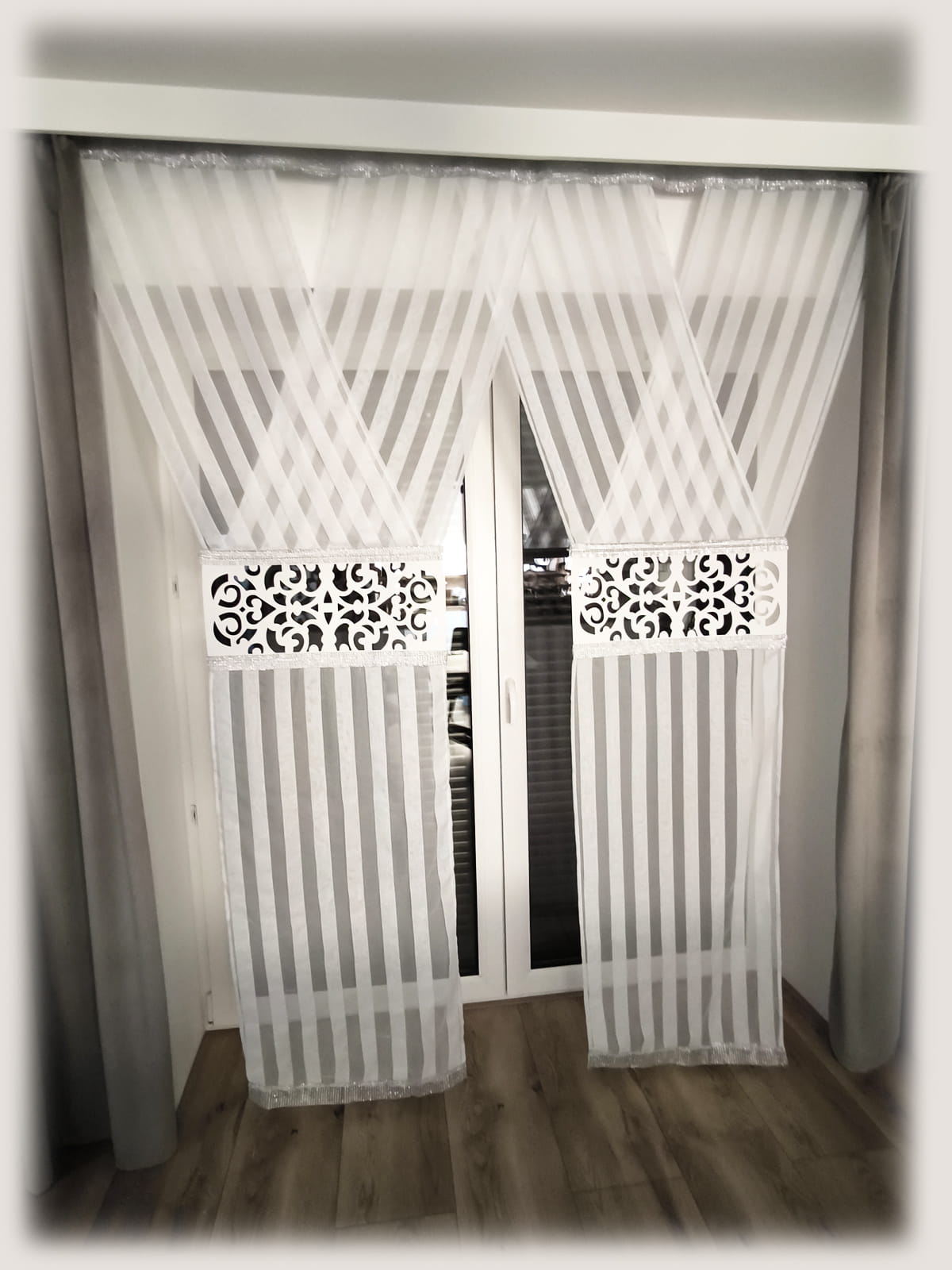 Panel okienny uszyty z gładkiego woalu szyty na zakładki, ozdobiony ażurową wstawką i pasami z cyrkonii.