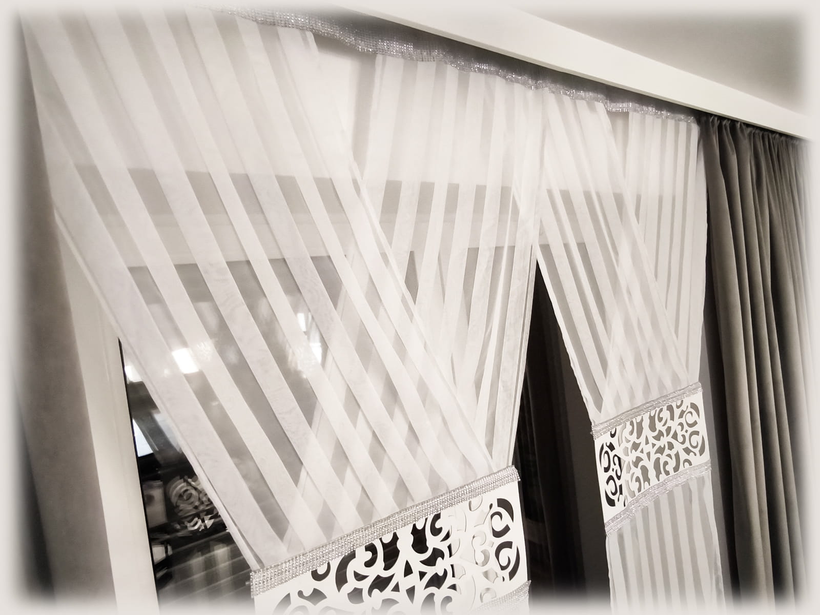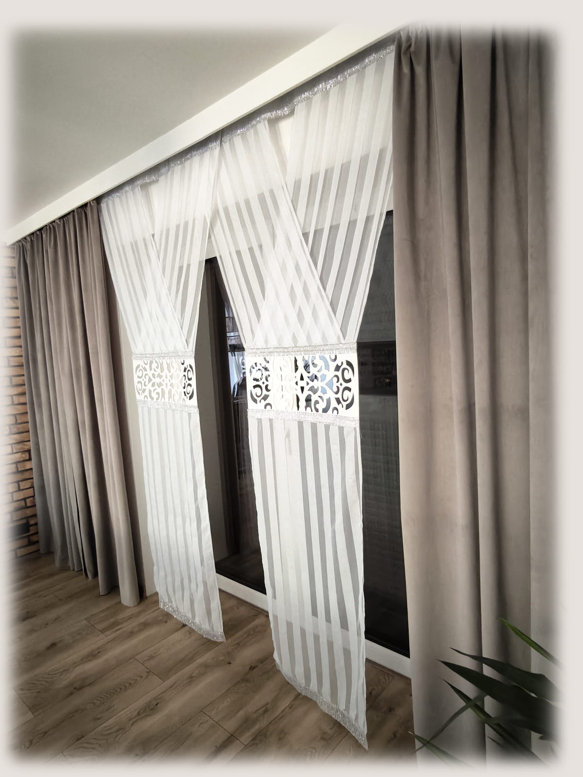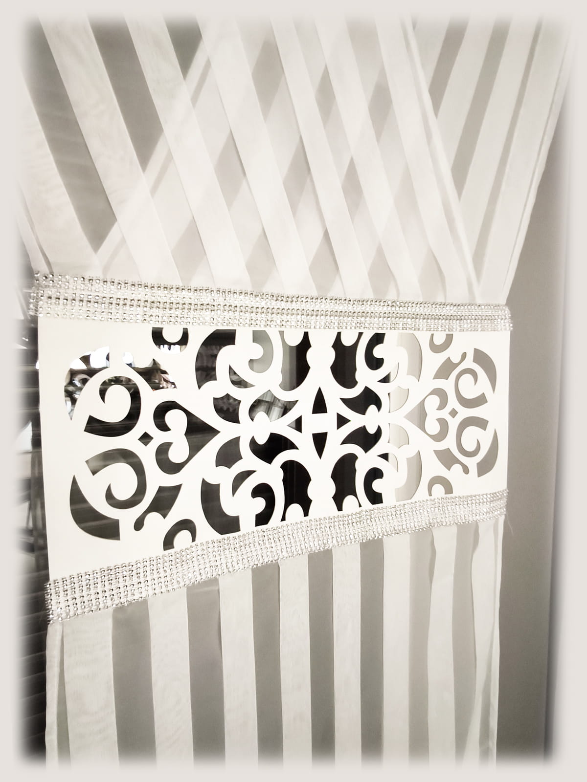 Panel okienny uszyty z gładkiego woalu szyty na zakładki, ozdobiony ażurową wstawką i pasami z cyrkonii.