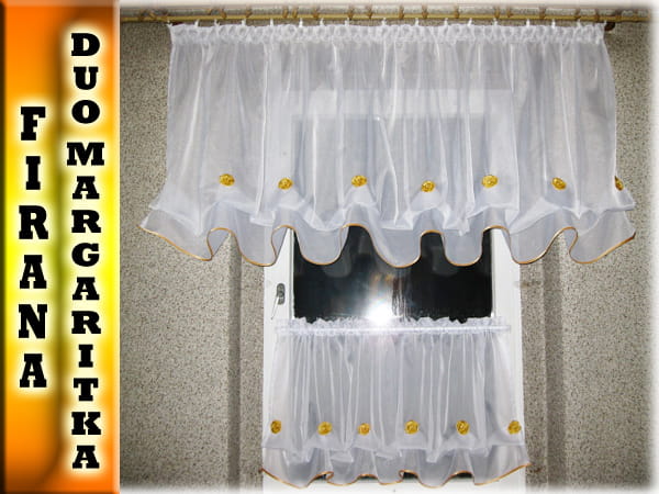 Główną ozdobą firanki są różyczki lub kokardki przymocowane po dwóch stronach firanki.