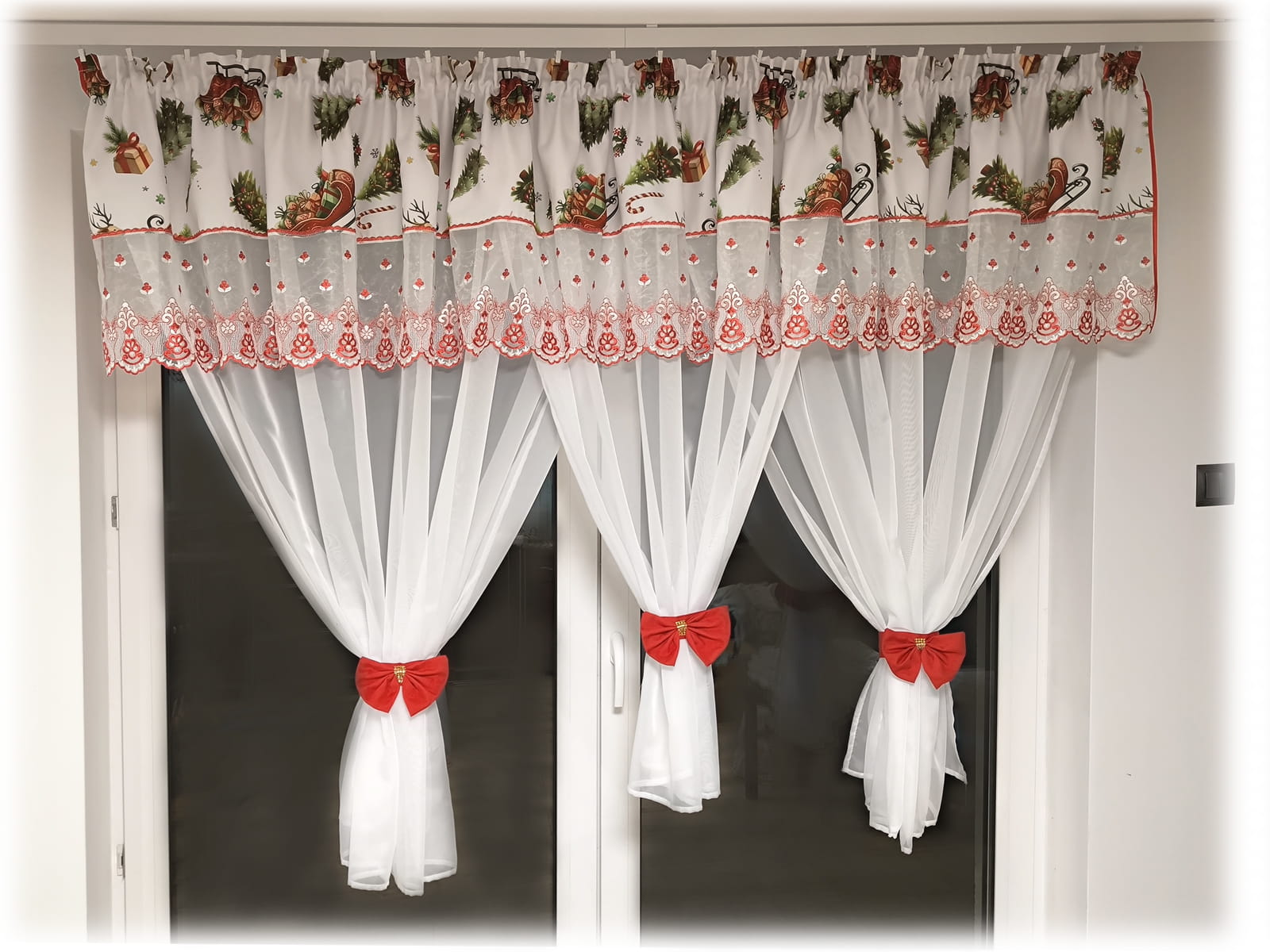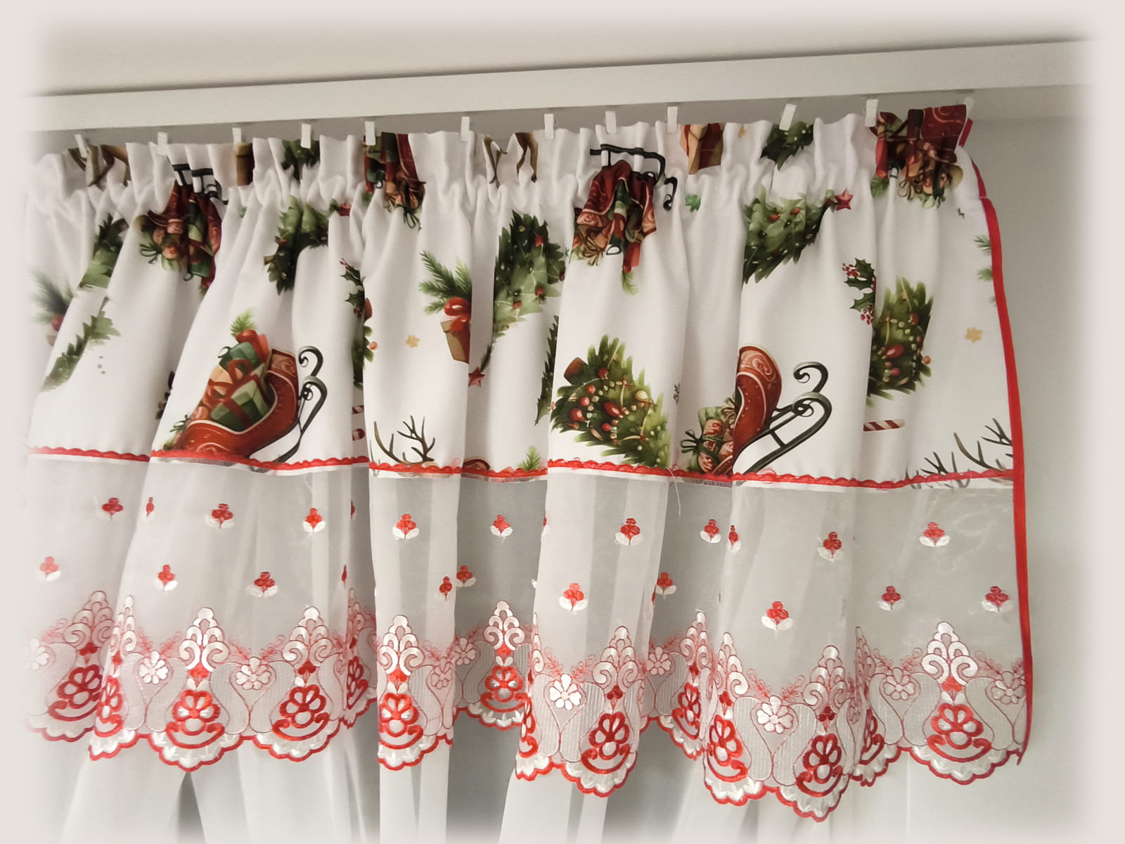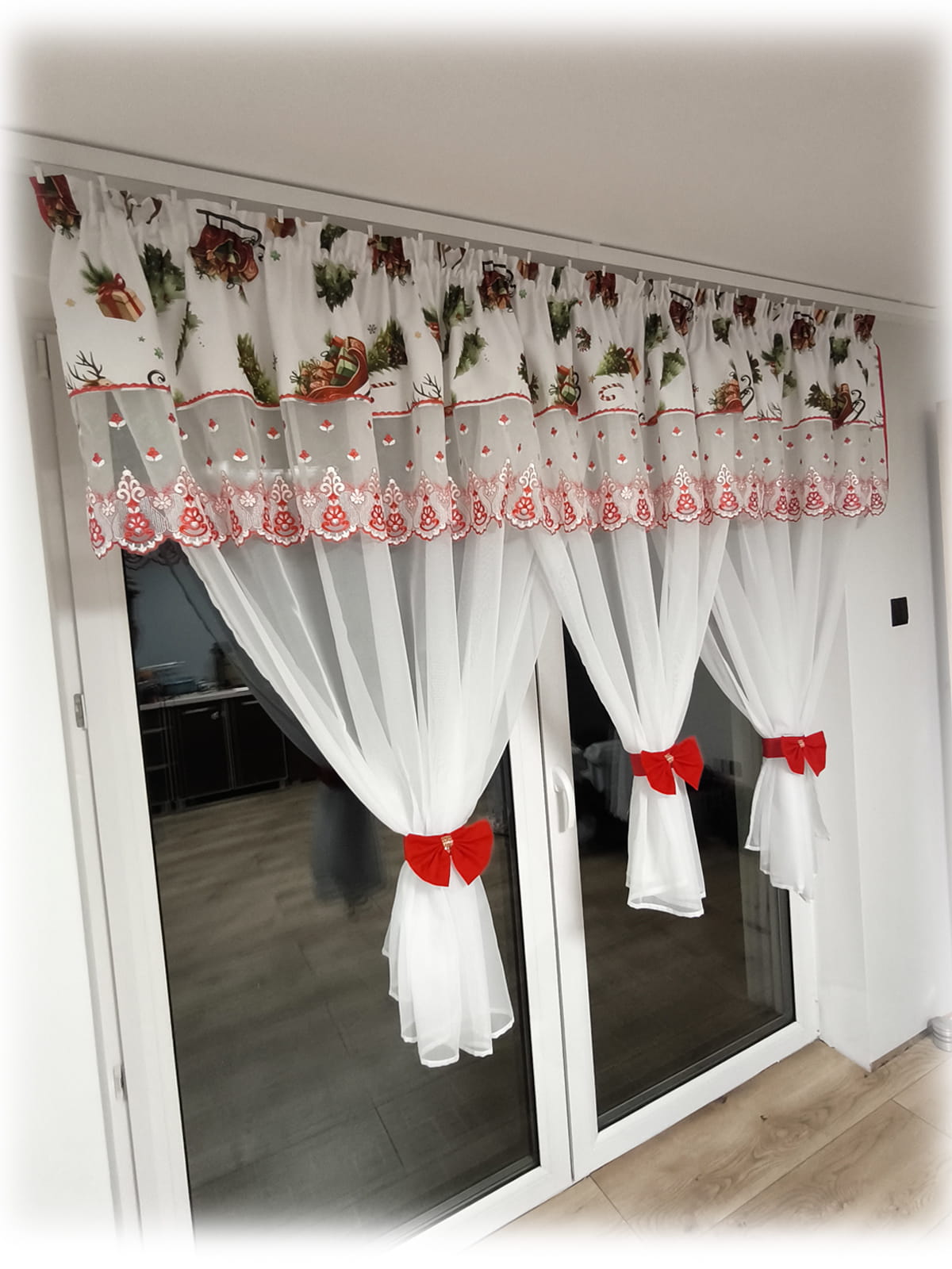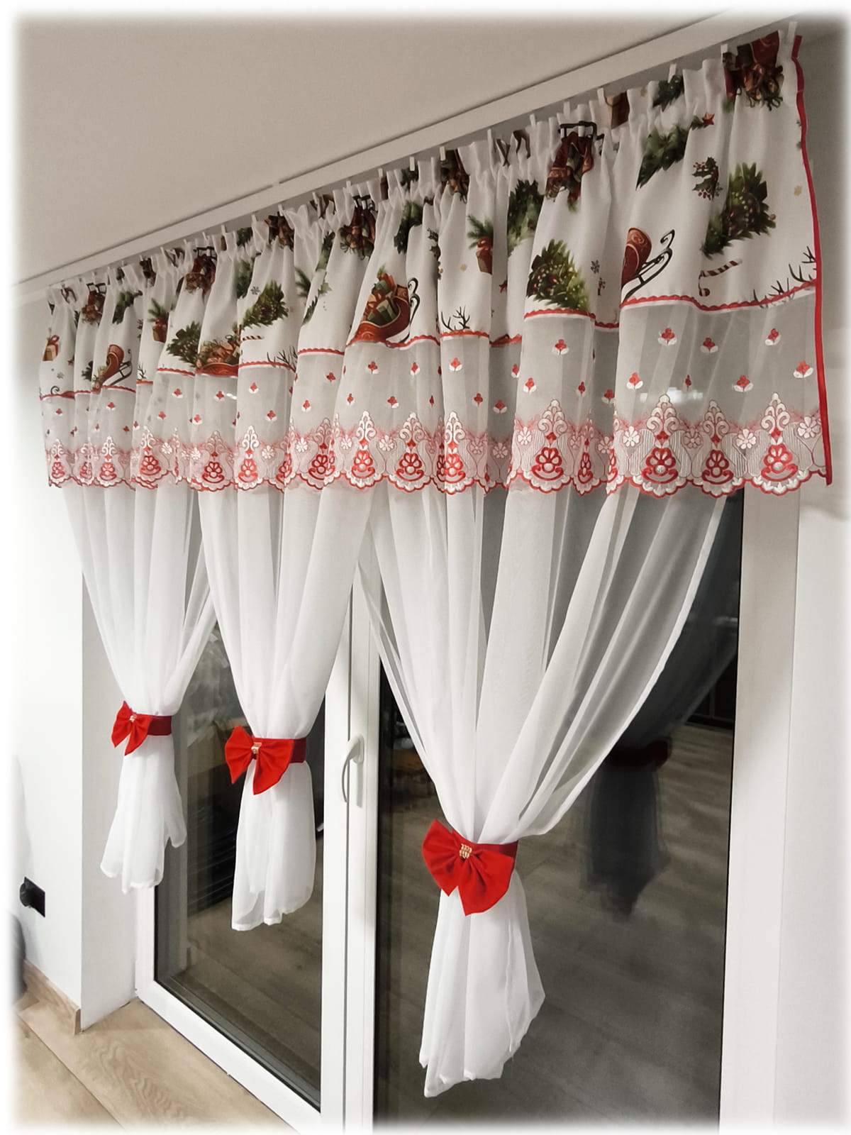 Zestaw wykonany z woalu gładkiego, tkaniny panama stretch oraz koronki z markizety z haftem. Uszyty na jednej taśmie. Góra ozdobiona jest lambrekinem ze świątecznym wzorem i markizetą z haftem.