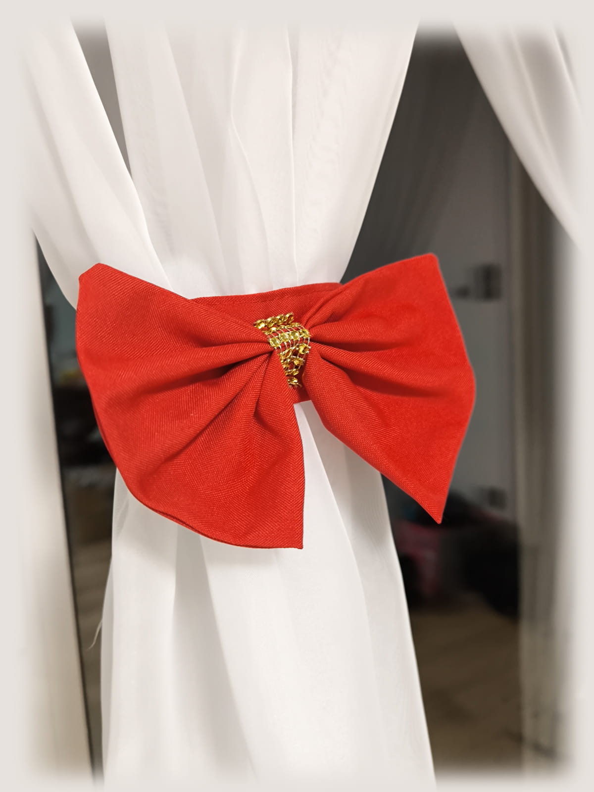 W zestawie 3 tasiemki z kokardkami do upięcia firanki.