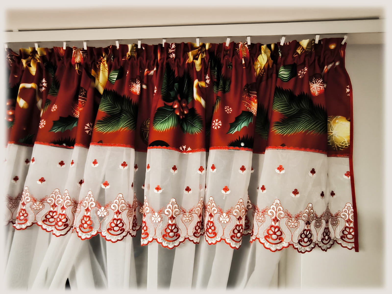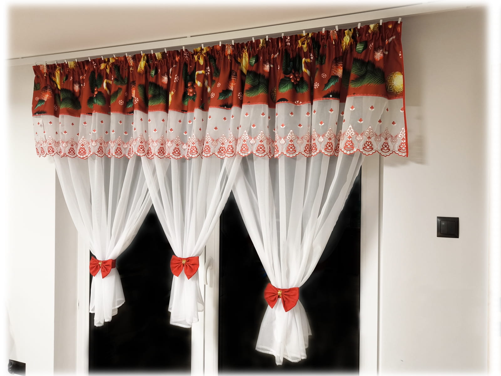 Zestaw wykonany z woalu gładkiego, tkaniny panama stretch oraz koronki z markizety z haftem. Uszyty na jednej taśmie. Góra ozdobiona jest lambrekinem ze świątecznym wzorem i markizetą z haftem.